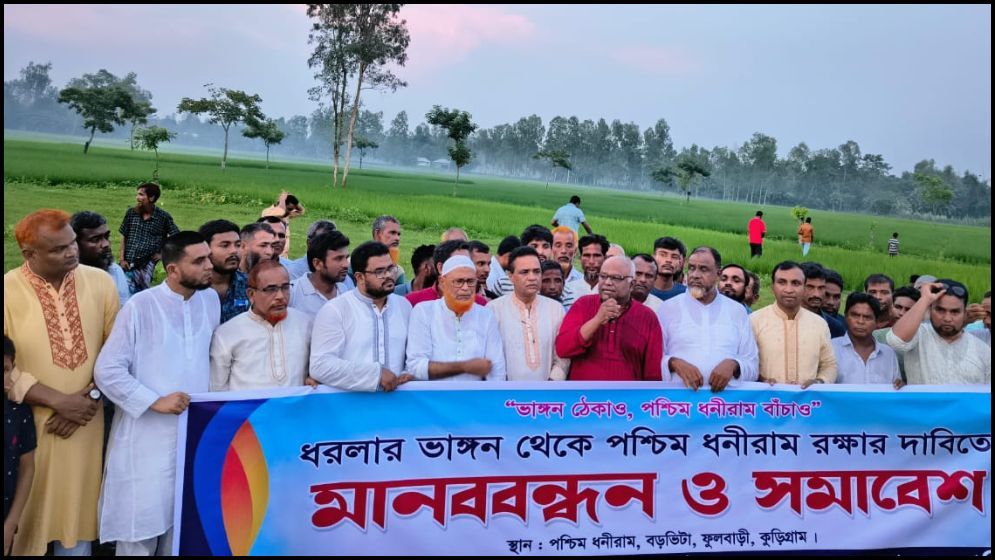 নদী ভাঙ্গন কবলিত এলাকার মানুষের দুর্দশা লাঘবে কুড়িগ্রাম জেলা উন্নয়ন ও বাস্তবায়ন পরিষদের উদ্যোগে রোববার বিকেলে মানববন্ধন ও সমাবেশ অনুষ্ঠিত হয়। সংগঠনের সভাপতি অধ্যাপক শফিকুল ইসলাম বেবু'র সভাপতিত্বে বক্তব্য রাখেন সংগঠনের সহ সভাপতি ও স্বাস্থ্য বিভাগের সাবেক পরিচালক ডা. শাহাদত হোসেন, যুগ্ম সম্পাদক ও কেন্দ্রীয় ছাত্রদলের সাবেক সহ সভাপতি মাহবুব মিয়া, সাংগঠনিক সম্পাদক সাংবাদিক সাইয়েদ আহমেদ বাবু, সহ সাংগঠনিক সম্পাদক আরিফুল ইসলাম আরিফ, স্বাস্থ্য বিষয়ক সম্পাদক ডাঃ রকিবুল হাসান বাঁধন, ফুলবাড়ী উপজেলা বিএনপির সাবেক সাধারণ সম্পাদক খোরশেদ আলম, ছাত্রনেতা হামিদুল ইসলাম প্রমুখ।