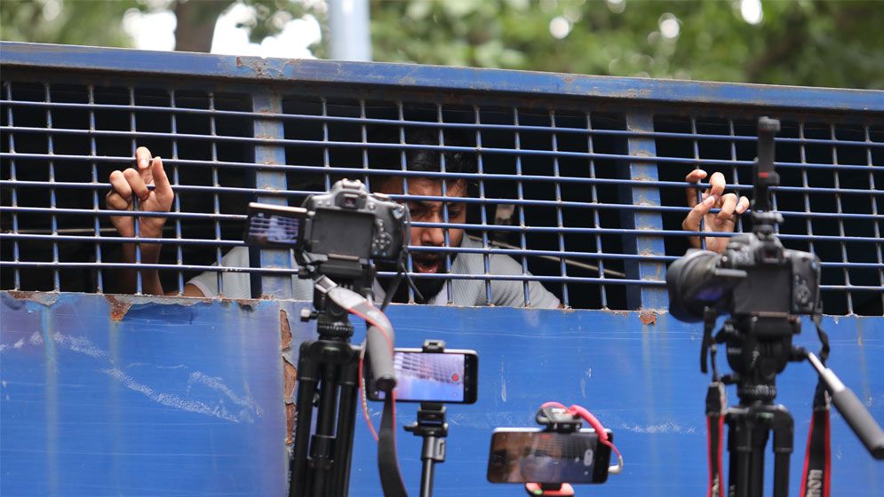 গ্রেপ্তার হওয়া ব্যক্তিদের প্রিজন ভ্যানে কারাগারে নেওয়ার পথে। গতকাল সিএমএম কোর্ট প্রাঙ্গণে। ছবি : সংগৃহীত