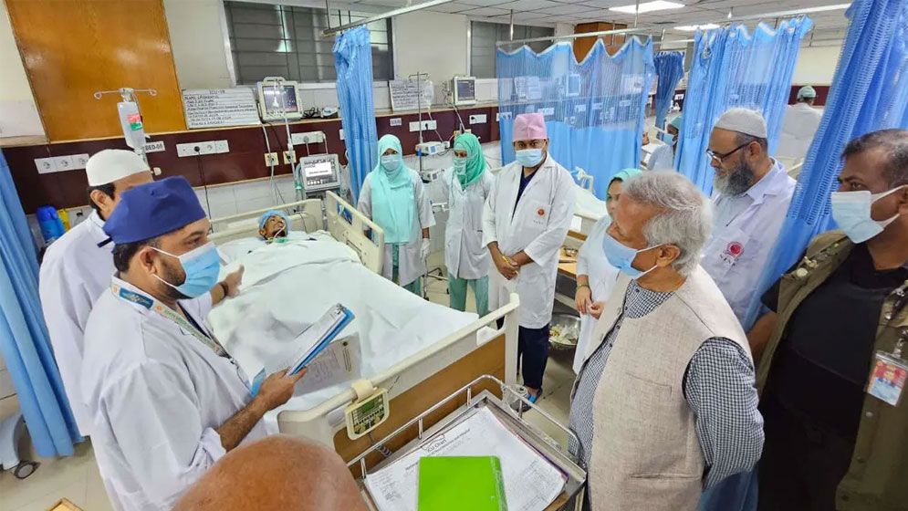 হাসপাতালের পরিচালক কাজী দ্বীন মোহাম্মদ বলেন, প্রধান উপদেষ্টা হাসপাতালের নিবিড় পরিচর্যা কেন্দ্রে চিকিৎসাধীন চার শিক্ষার্থীর অবস্থা দেখেছেন। পরিচালক বলেন, চারজনই মাথায় গুলিবিদ্ধ হয়েছে। তাদের অবস্থার উন্নতি হচ্ছে।