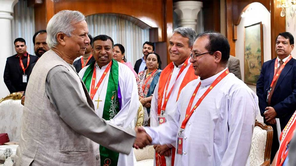 বড়দিন উপলক্ষে যমুনায় খ্রিস্টান সম্প্রদায়ের প্রতিনিধিদের সঙ্গে শুভেচ্ছা বিনিময় করেছেন প্রধান উপদেষ্টা ড. মুহাম্মদ ইউনূস। ছবি: সংগৃহীত