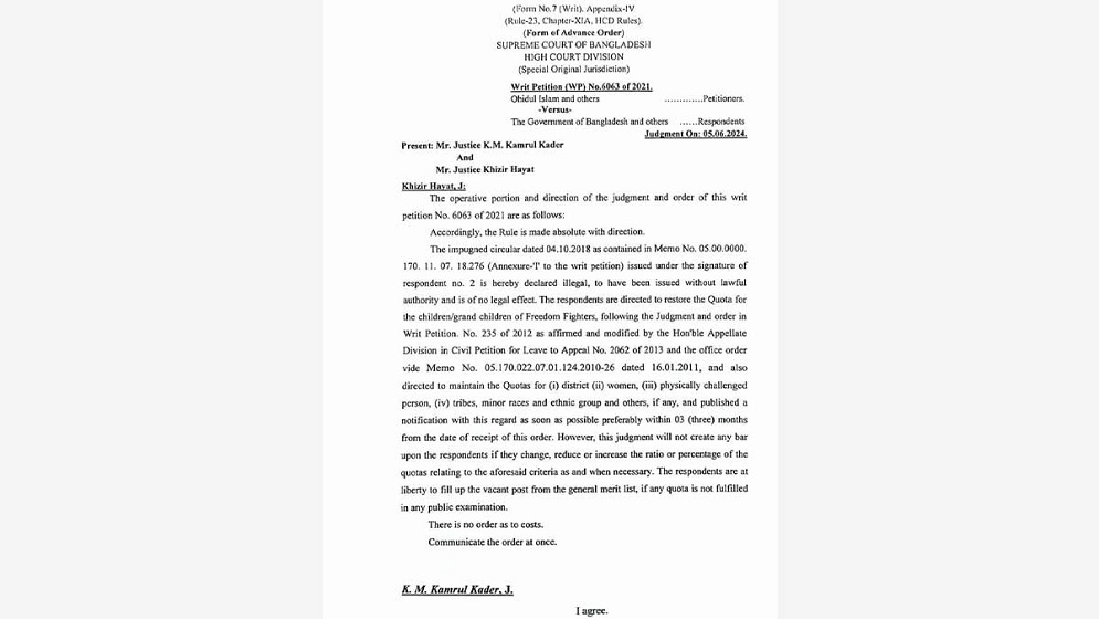 ২০২১ সালে কোটা বাতিল করে সরকারের পরিপত্রের বৈধতা চ্যালেঞ্জ করে রিট করেন বীর মুক্তিযোদ্ধার সন্তান অহিদুল ইসলামসহ সাতজন। রিটের প্রাথমিক শুনানি নিয়ে ২০২১ সালের ৬ ডিসেম্বর রুল দেন হাইকোর্ট। চূড়ান্ত শুনানি শেষে গত ৫ জুন রুল অ্যাবসলিউট (যথাযথ) ঘোষণা করে রায় দেন হাইকোর্ট।