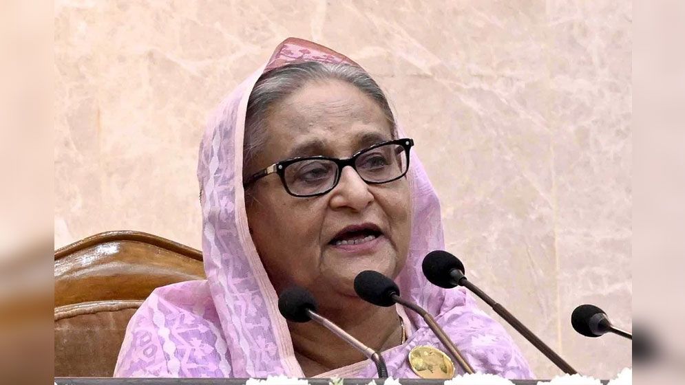 প্রধানমন্ত্রী শেখ হাসিনা তার কার্যালয়ে এক অনুষ্ঠানে বক্তৃতা দেন। ছবি: পিআইডি